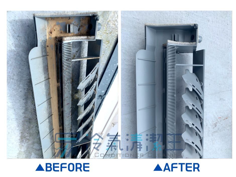 主要是用高壓清洗機清洗冷氣機殼上的積塵和散熱鰭片上的髒污。室外機不予拆卸(不從安裝位置移動),且需視現場環境才能決定可否施作,若室外機懸掛在外牆上或人員無法觸及,則無法進行冷氣清洗。