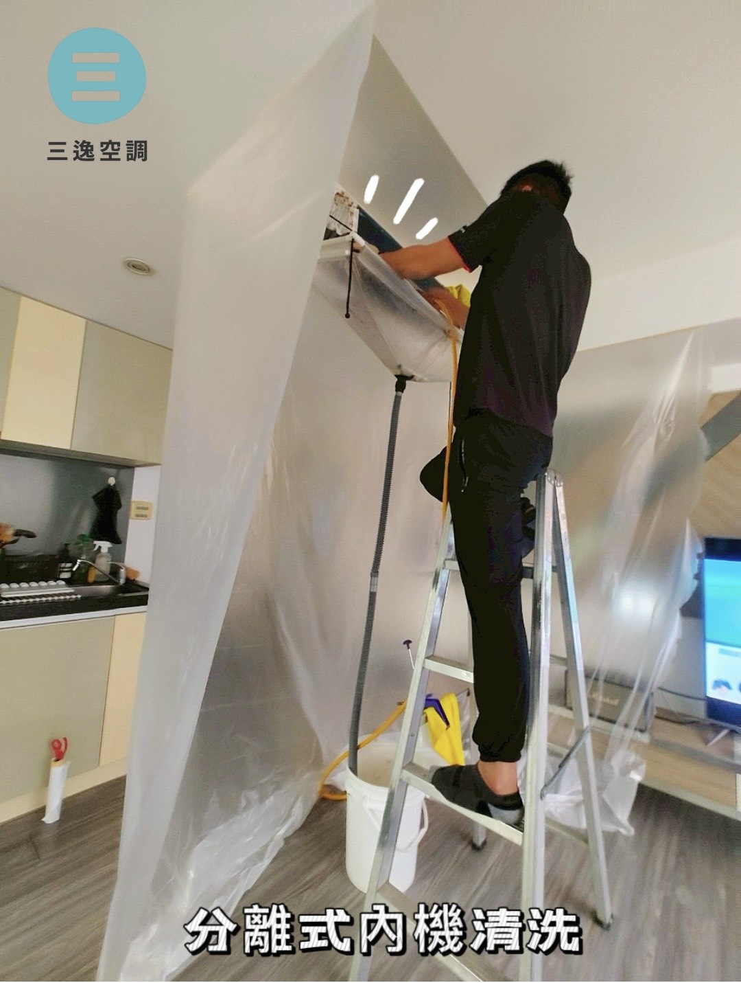 分離式冷氣 | 分離式冷氣有室內機及室外機兩個部分需要清洗,清洗時也會分開收費。清洗室內機時不需要將整台機器拆下,先拆除面板及過濾網後,用清水和清潔劑清洗室內機。清潔室外機的內部風扇時,通常會使用清潔劑和高壓水槍進行清洗,但在清洗過程中必須小心謹慎,以避免水噴到壓縮機或電路板上。 |